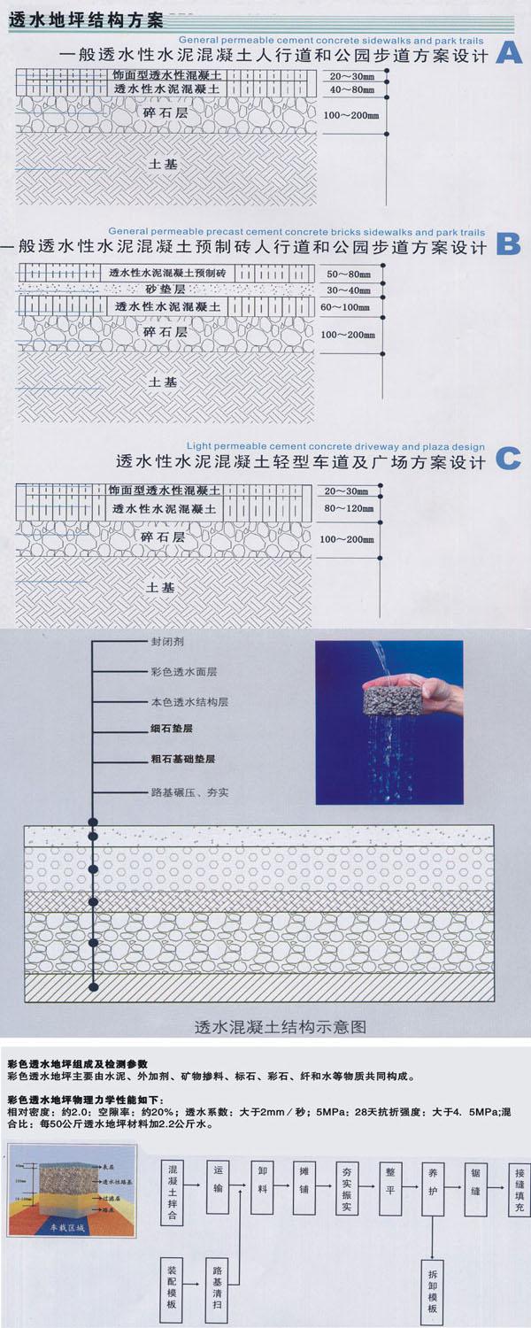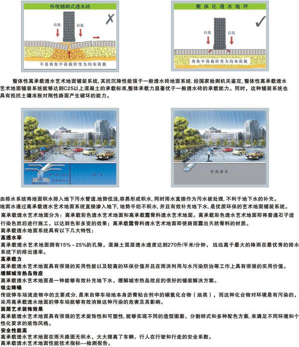 e、透水混凝土地坪整體性強,使用壽命長,近似于普通混凝土的使用年限;同時又彌補了透水磚的整體性差、高低不平、易松動、使用周期短等不足。